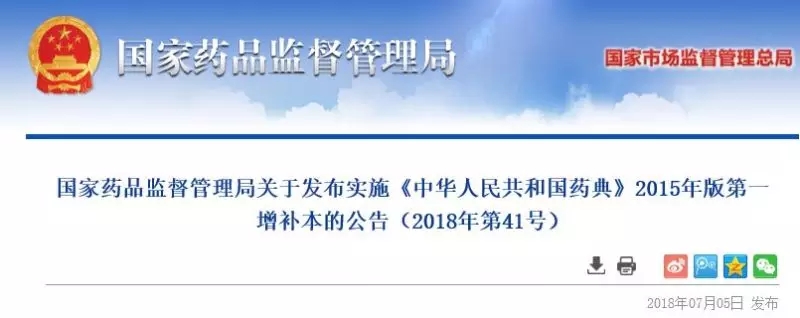 7月5日,國家藥監局發布通告,《中華人民共和國藥典》2015年版第一增補本已編制完成。此增補本自2019年1月1日起施行。